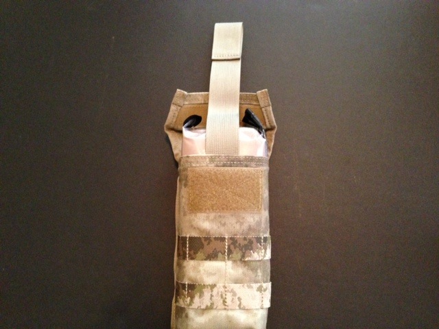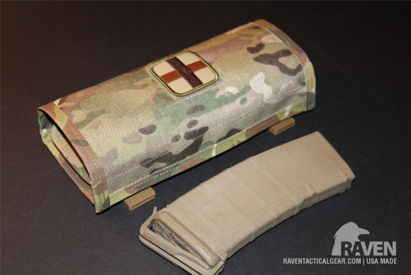 About the same size as a double stack AR Mag Pouch. Deploy tab lifts medical supplies up and out. Wrap around cover keeps dirt out with loop fields on front for Medical ID or Blood Type Patches.