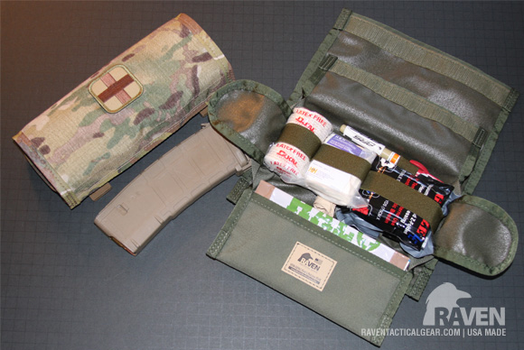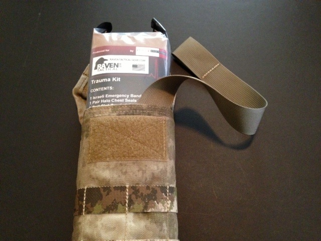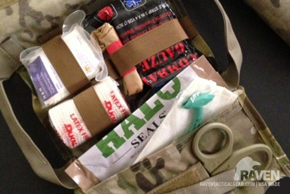 Quick Clot Combat Gauze LE, Z-Folded, Nasopharyngeal Airway 28fr w/lube, (1pr) HALO Chest Seals, Israeli Bandage 4", H&H Compressed Gauze, Elastic Bandage 3", Nitrile Gloves Large (1pr).