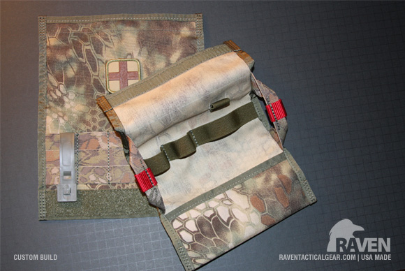 About the same size as a double stack AR Mag Pouch. Deploy tab lifts medical supplies up and out. Wrap around cover keeps dirt out with loop fields on front for Medical ID or Blood Type Patches.